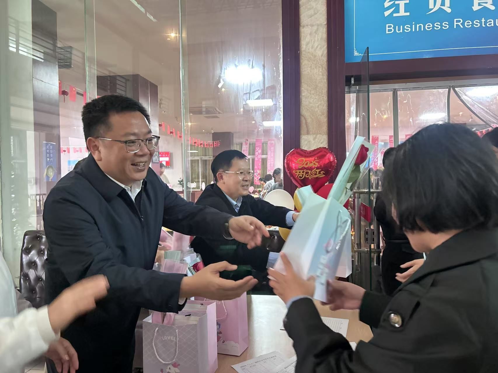 王华书记和陈修焕副校长在教职工食堂向所有女同胞送上诚挚的问候和祝福