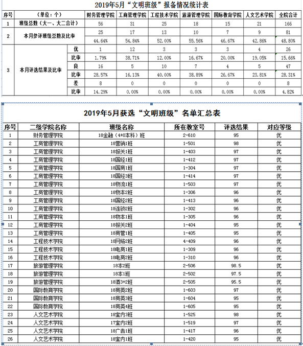5月份,学院共有81个班级参与“文明班级”创建活动中,其中26个班级圆满完成本月创设指标,表现优秀,被评为“文明班级”。具体情况如下: