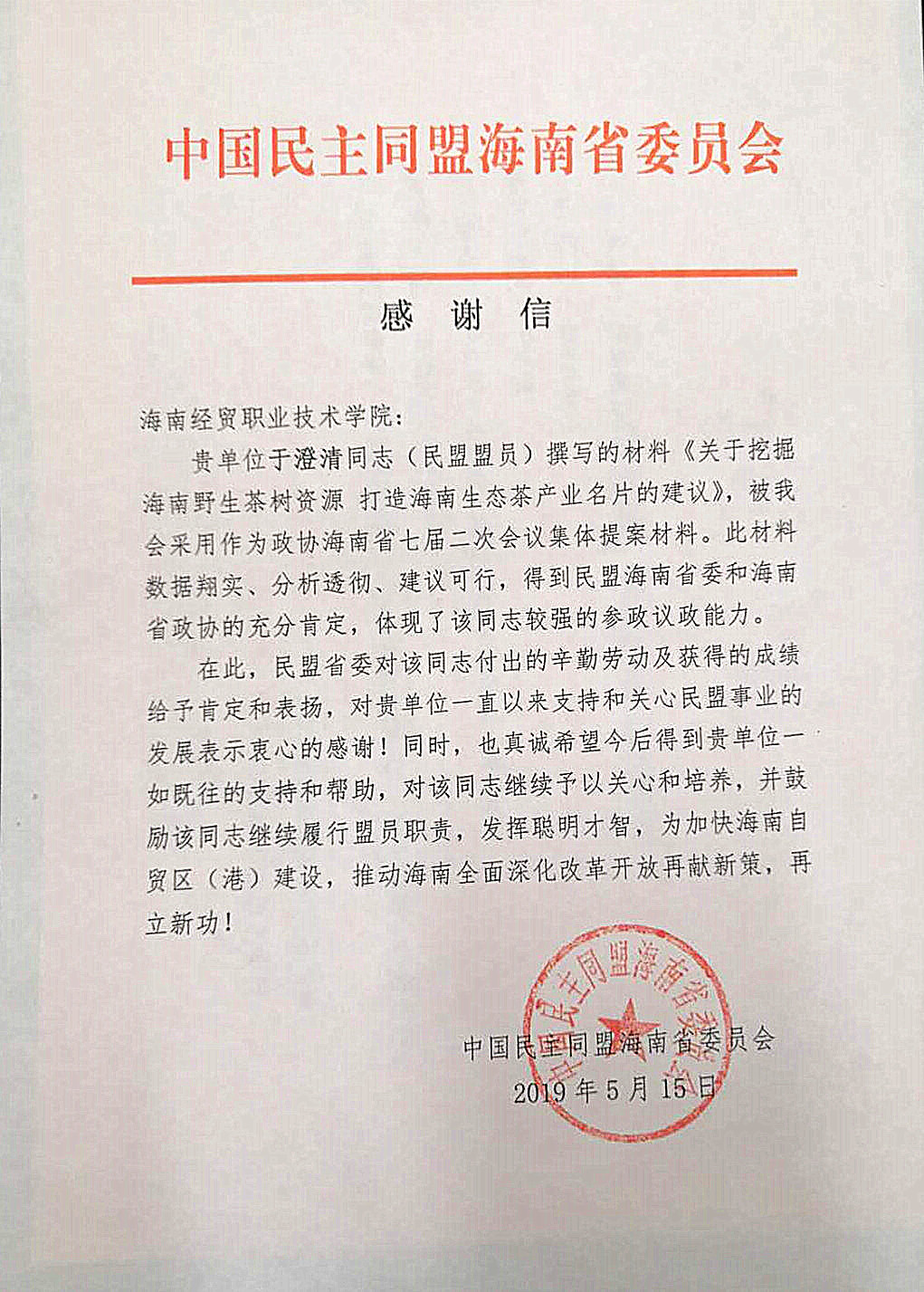 中国民主同盟海南省委致beat365英国官网网站的感谢信