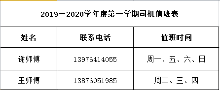 根据实际工作需要,现将2019—2020学年度第一学期司机值班安排如下: