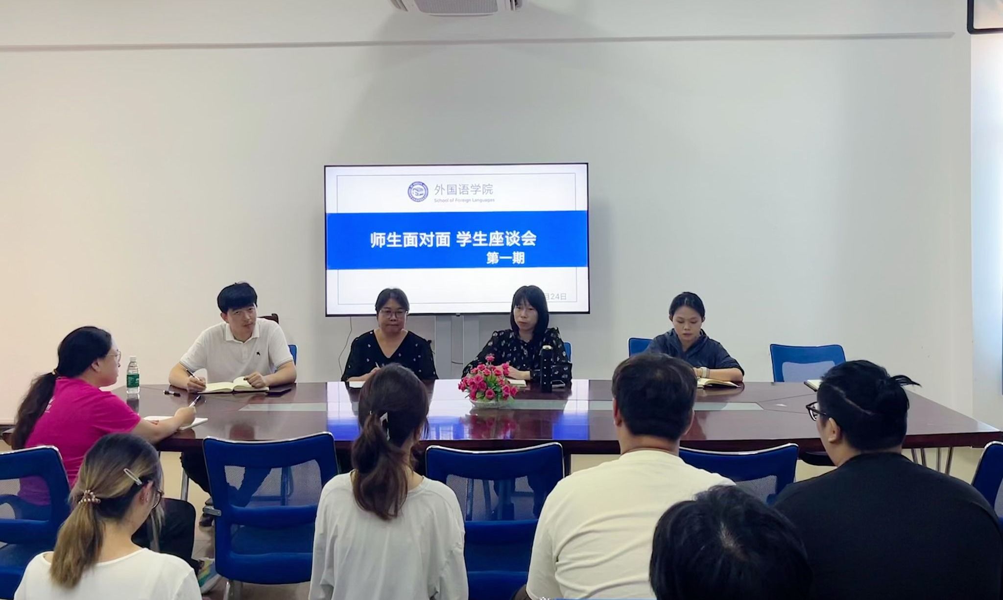 2025年4月24日,外国语学院召开第一期“师生面对面”学生座谈会。学院党政班子相关负责人、全体辅导员以及22名学生代表齐聚一堂,围绕教学管理、学业发展、校园生活等议题展开坦诚交流,现场气氛热烈融洽。