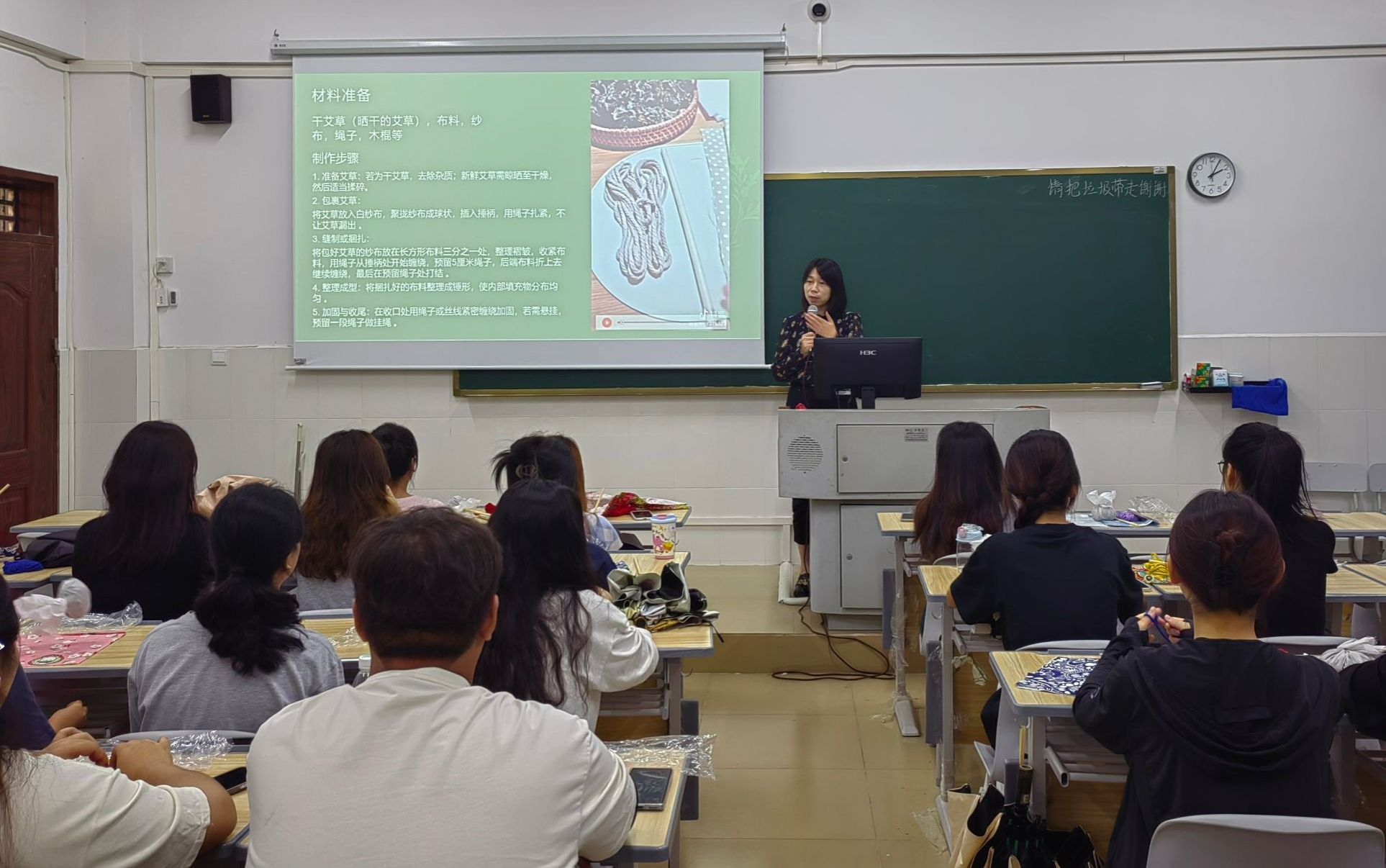 此次活动以中华优秀传统文化为纽带,结合手工制作艾草手工艺品形式展开。在辅导员的指导下,同学们通过揉捏、缠绕、捆扎等步骤,将艾草叶、棉布等材料转化为兼具实用与观赏性的艾草养生锤。现场氛围温馨愉快,同学们在艾香里建立情感联结,传递温暖关怀,缓解日常学业与生活中的不良情绪。