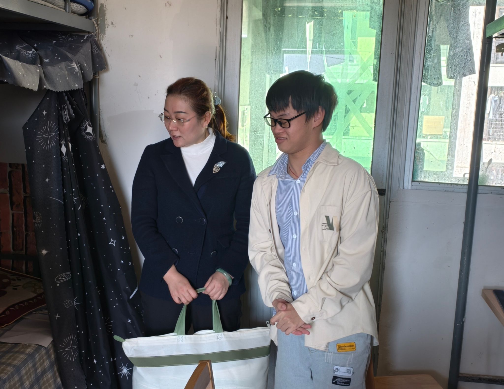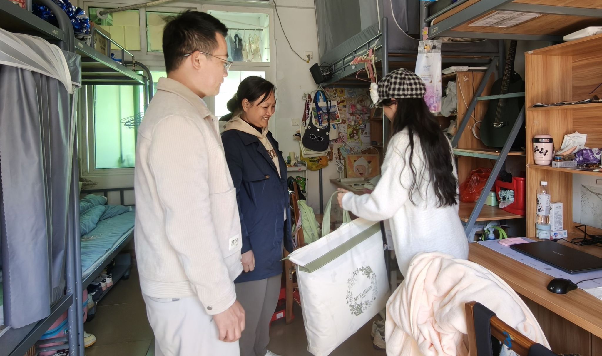 “海口突然降温,大家要注意保暖,照顾好身体。”在学生宿舍,老师们亲手递上物资,轻声叮嘱。接过这份突如其来的“温暖包”,同学们的脸上露出了惊喜和感动的笑容,纷纷表示这份及时的关怀不仅驱散了身上的寒意,更让他们深深感受到了学院大家庭的细致温暖与依靠。