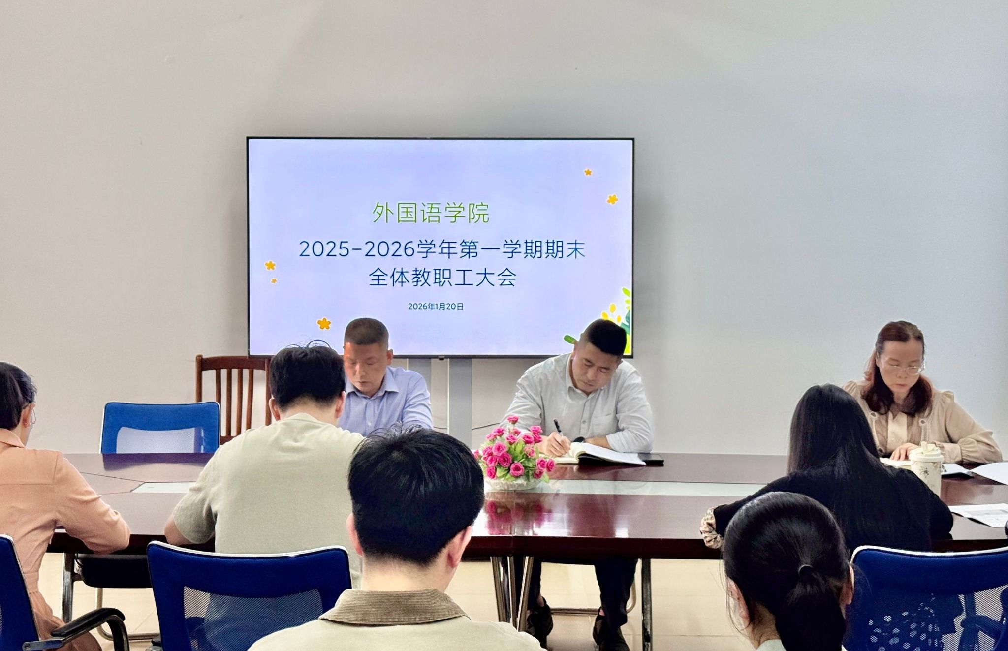 2026年1月20日,外国语学院召开2025-2026学年第一学期期末全体教职工总结大会,学院党政领导班子成员及全体教职工参会。