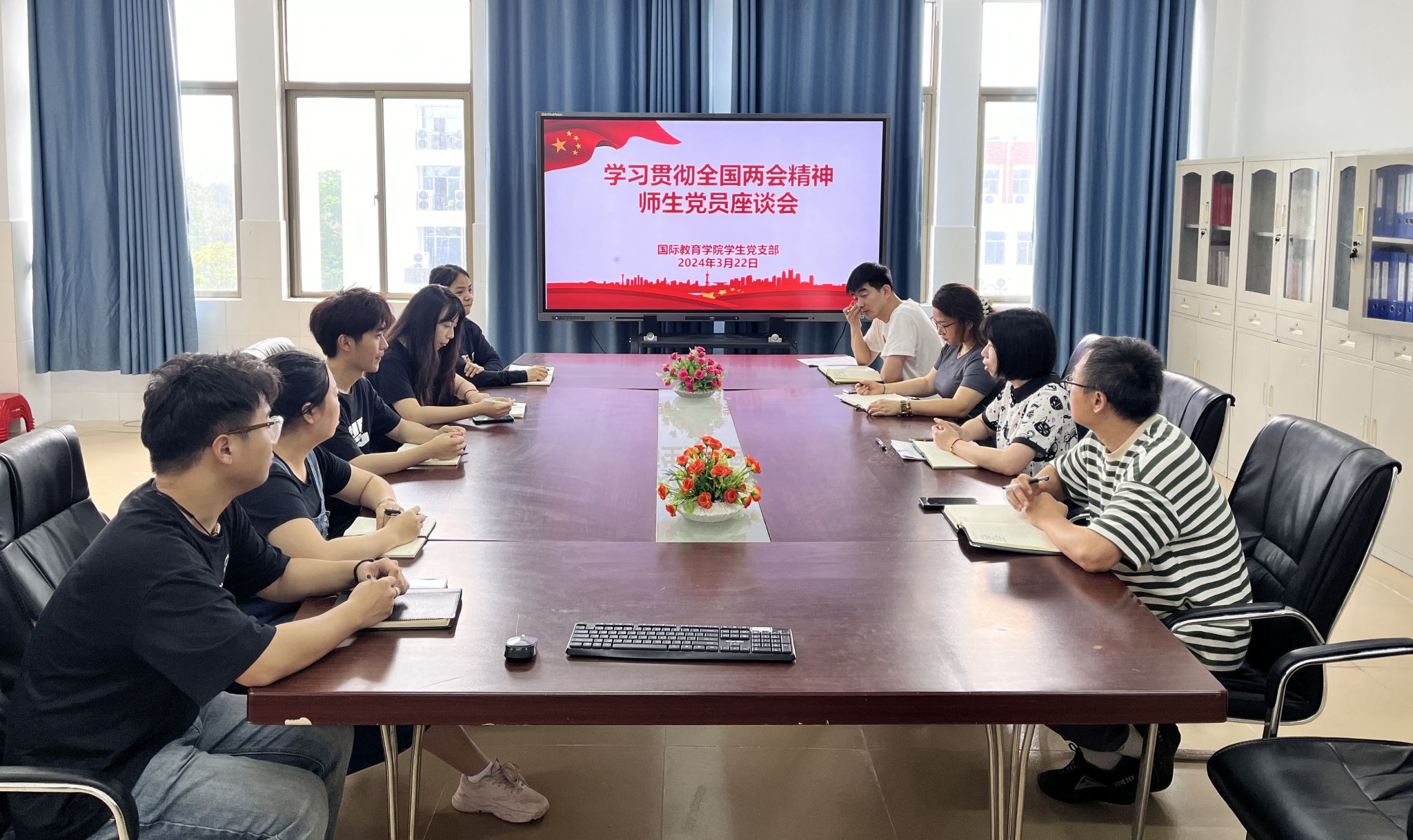 2024年3月22日,国际教育学院学生党支部召开学习贯彻全国两会精神师生党员座谈会。支部全体党员教师和学生党员代表参加了座谈会。