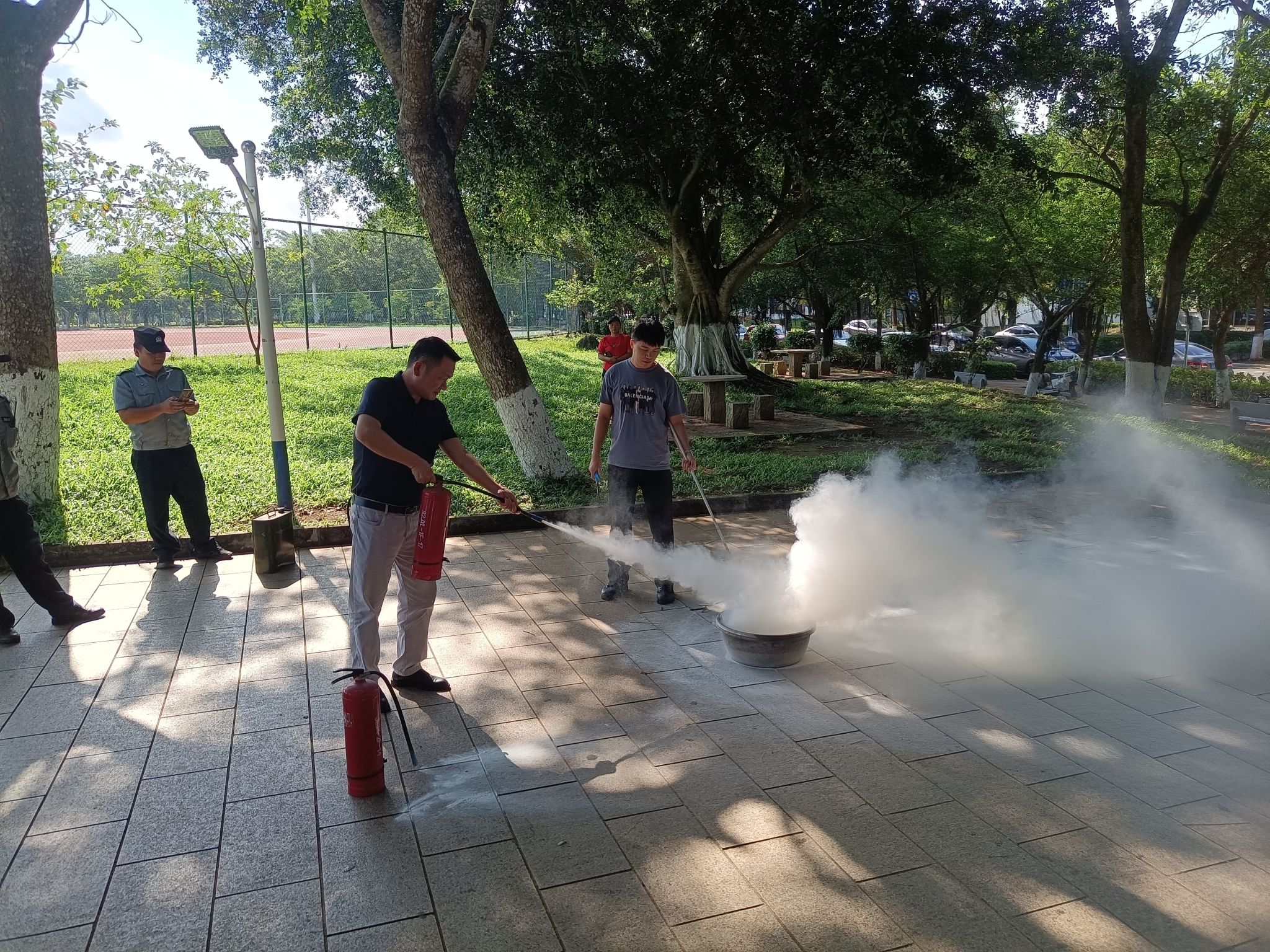 培训会结束后,师生们在户外进行了消防灭火演练。大家认真观摩灭火操作演示,并学习使用灭火器规范灭火的技能。通过此次消防安全教育活动,大家表示深受警示,受益匪浅,进一步增强了消防安全防范意识,提升了防范火灾和应急处置的能力。