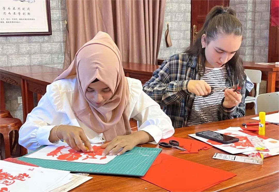 第三期活动是学习剪纸艺术。尽管是初次接触,留学生们却展现出了无比的热情。活动室内,一张张红纸铺陈开来,等待着大家的巧手赋予其生命。他们的眼神中闪烁着好奇与期待,手指在剪刀与纸张间轻盈跳跃,脸上洋溢着成就感,创作出的作品凝聚着对中华文化的尊重与热爱。