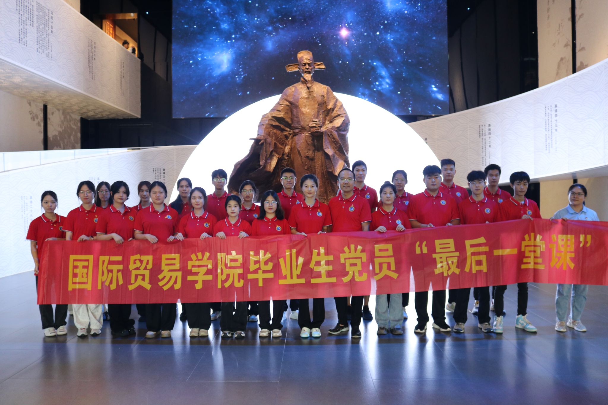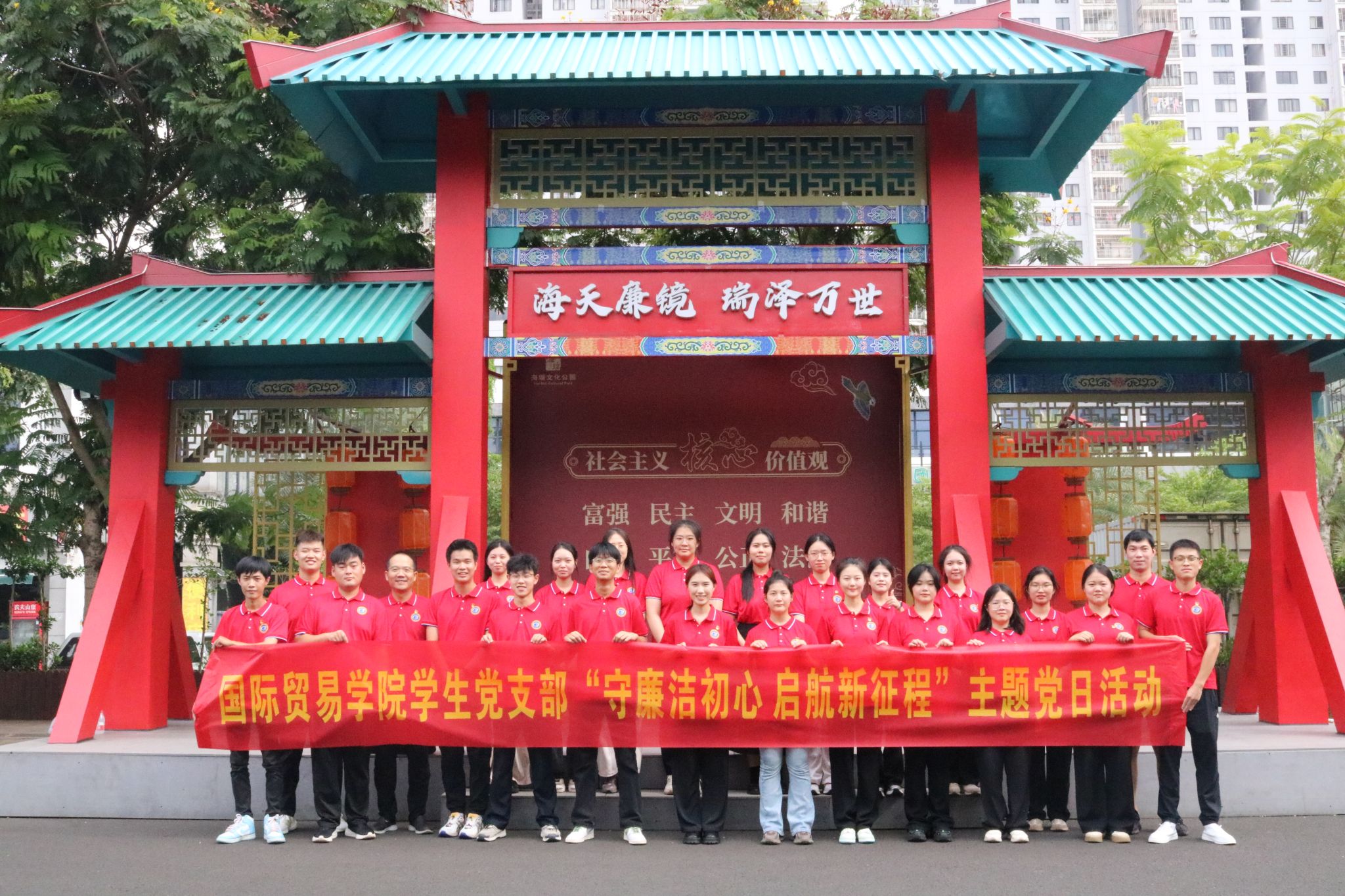 2024年6月18日,国际贸易学院学生党支部赴海瑞文化公园开展2024届毕业生党员“最后一堂课”暨“守廉洁初心 启航新征程”主题活动。学院党总支书记张修志、学生支部印华老师及全体毕业生党员参加。