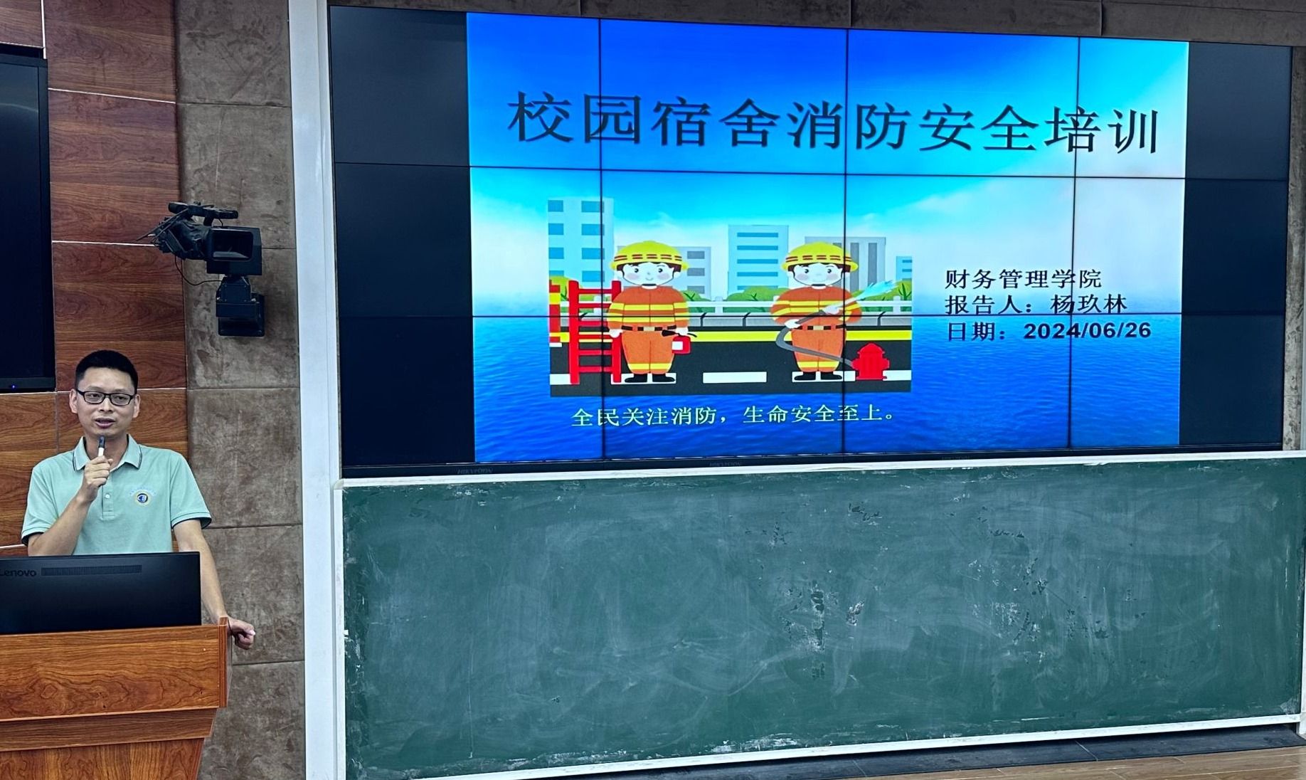 杨玖林老师讲解了消防安全的重要性,结合近年来校园典型消防安全警示案例,详细分析了宿舍消防隐患的原因,向同学们展示了火灾的严重后果,提醒同学们不要使用大功率违规电器、私拉电线、点蜡烛或蚊香、焚烧杂物。杨玖林还为同学们演示了常见干粉灭火器的正确使用方法,强调在火灾初期应迅速采取行动,冷静判断火势,正确使用灭火器和报警,并根据火势实际情况快速逃生。