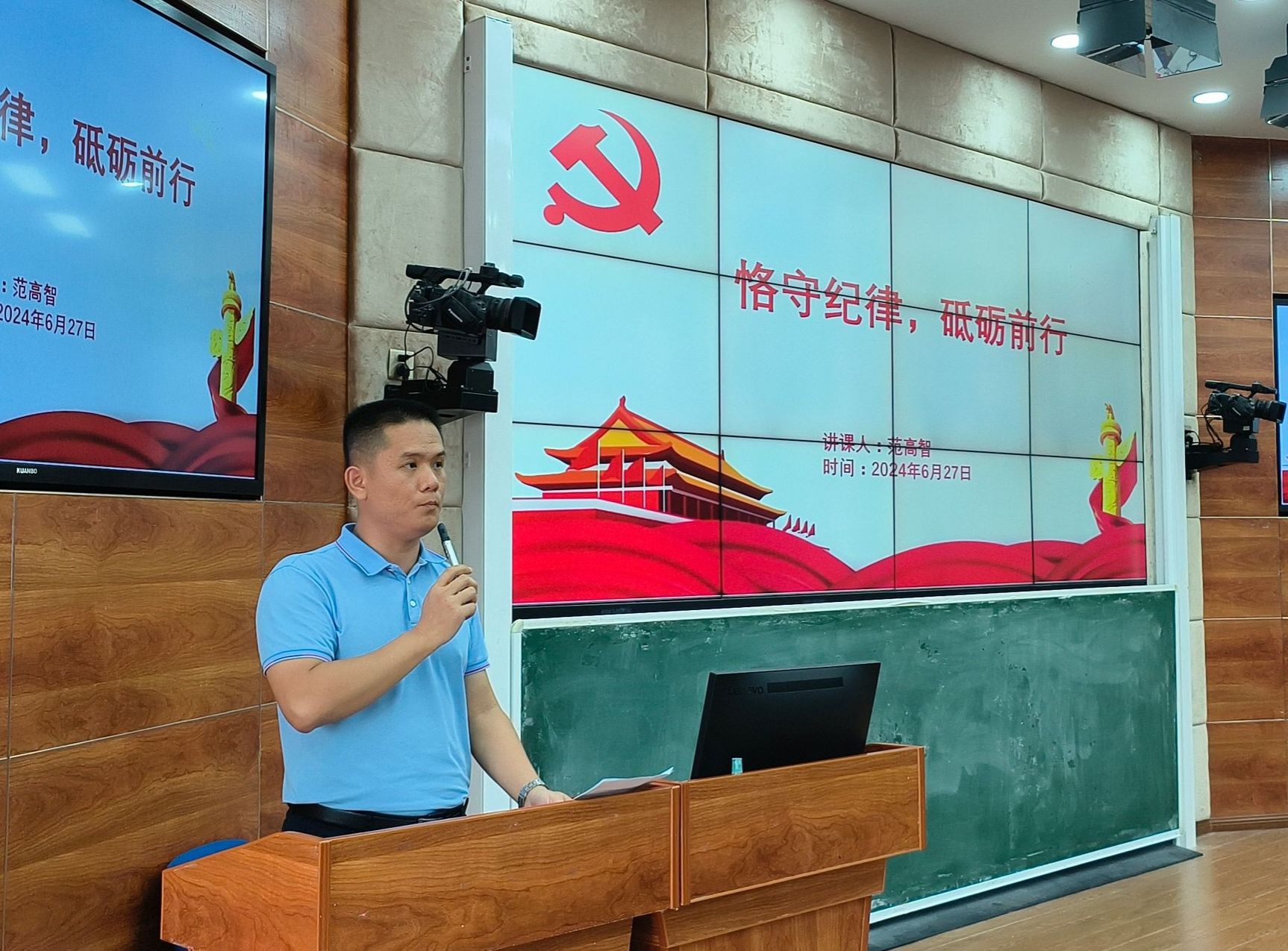 范高智以“恪守纪律,砥砺前行”为题讲授专题党课。他说,党员同志要充分认识党纪学习教育的重要意义,一要学党纪,铸魂立根,让忠诚之光照亮前行路。二要知党纪,心存敬畏,保纪律红线不可逾越。三要明党纪,正派作风,让规矩意识引领为民之路。四要守党纪,做到清正廉洁,担当作为。