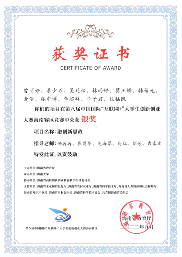 在团队的不懈努力下,该项目2022年7月获得了海南省大学生“互联网+”创新创业大赛银奖、海南省泛珠三角计算机作品大赛二等奖等诸多奖项,并被中国教育电视台采访。“我们能够协助思政课老师制作融媒创新教学课件,展示思政创新课堂,让有意义的内容更有意思。”曾丽娅激动地说。