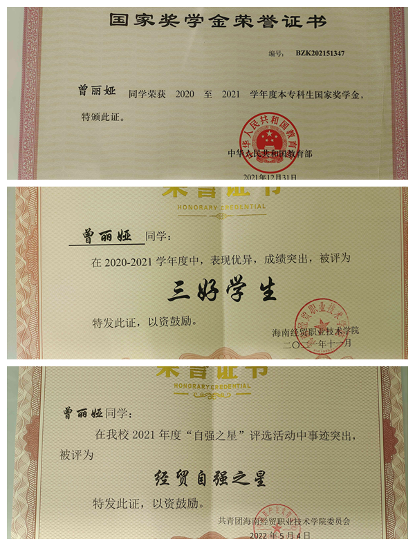 曾丽娅充分利用大学时光,提前考取了“1+x”融媒体制作中级证书。她的学习成绩一直名列前茅,获得2021、2022年国家奖学金,荣获“经贸自强之星”“三好学生”等荣誉称号。