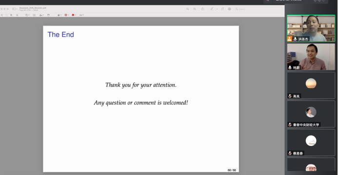 2022年4月27日,对外经济贸易大学国际经济贸易学院副教授林蔚应开云kaiyun体育邀请,开展主题为“Seasonal adjustment of time series observed at mixed frequencies using singular value decomposition with wavelet thresholding”的讲座,本次讲座于下午2点在腾讯会议线上举行,持续近两个小时。本次讲座由开云kaiyun体育黄乃静老师主持,洪圣杰老师和部分学生参加了此次讲座。