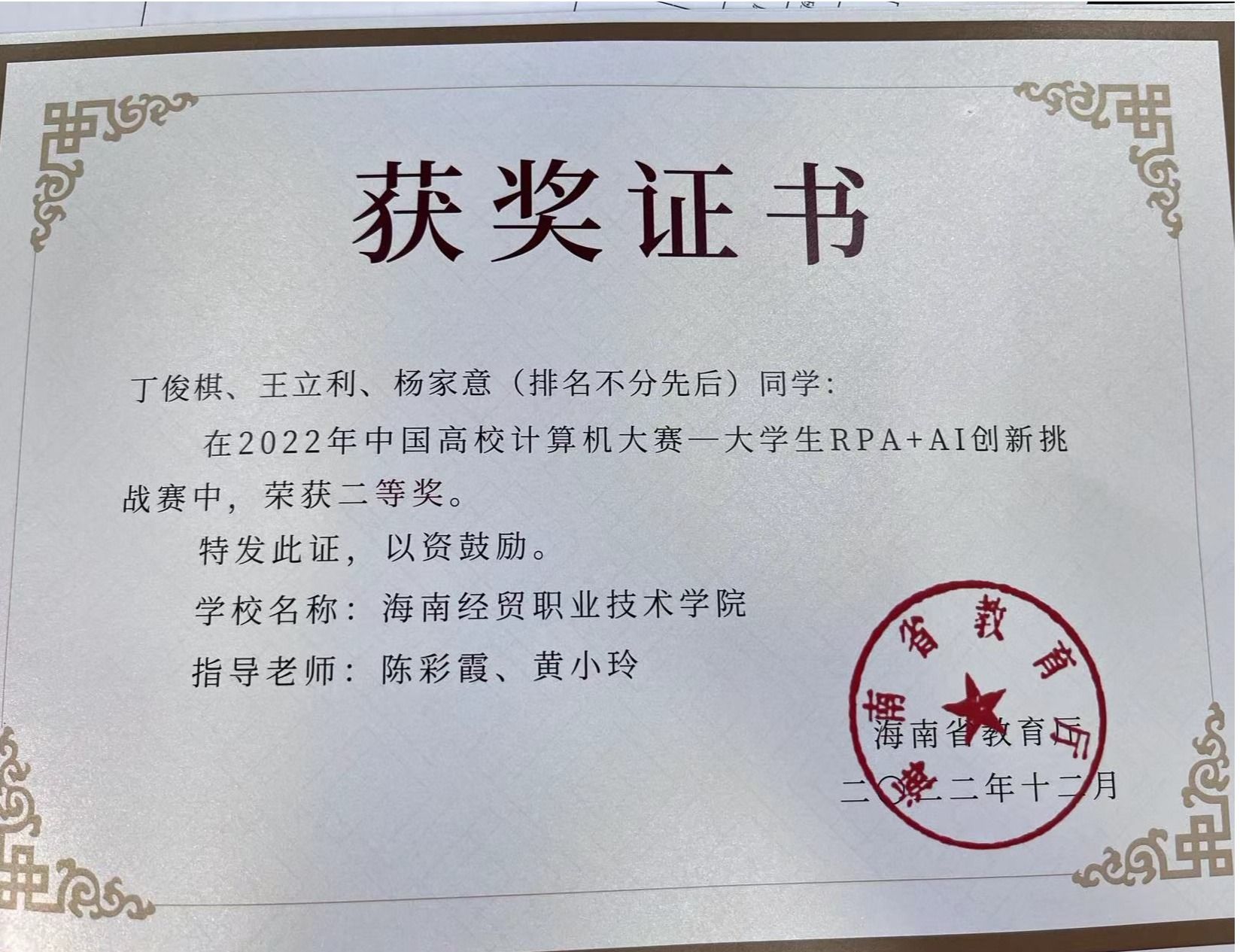 丁俊棋在创新创业的道路上,有很好的创意和很强的执行力。作为“骑森-柜在生活”项目的路演发言人,他精心准备每一个细节,投入大量时间进行练习,不断改进语音表达和肢体语言。“每一句话,我和我的团队成员都反复修改很多次,争取实现完美表达,让评委对我们的项目更感兴趣。”他和小伙伴们的努力和坚持也最终结出累累硕果,他们的项目在海南省第八届、第九届“互联网+”大学生创新创业大赛和2022年“挑战杯”大学生创新创业计划竞赛省级决赛中获得银奖。
