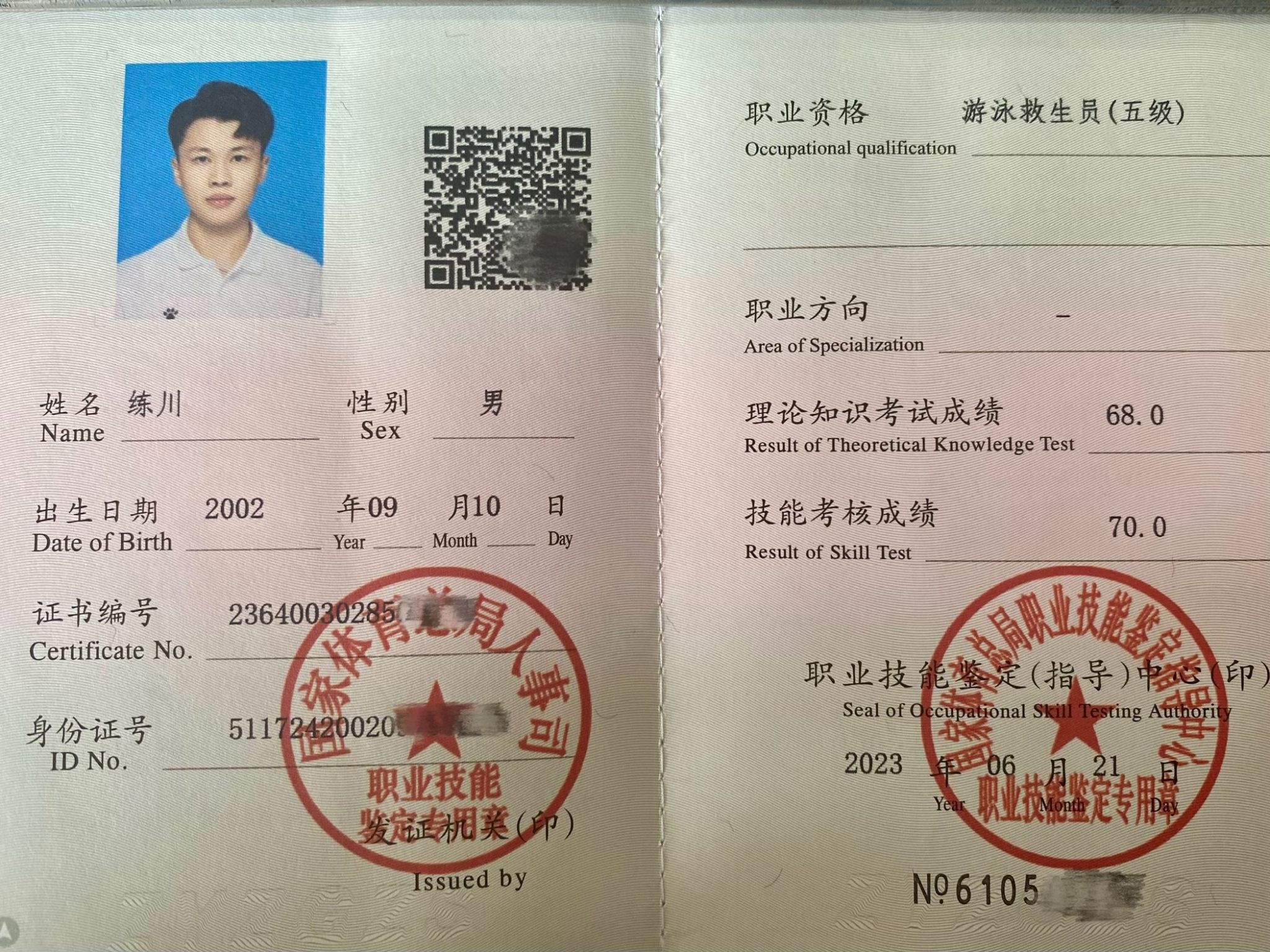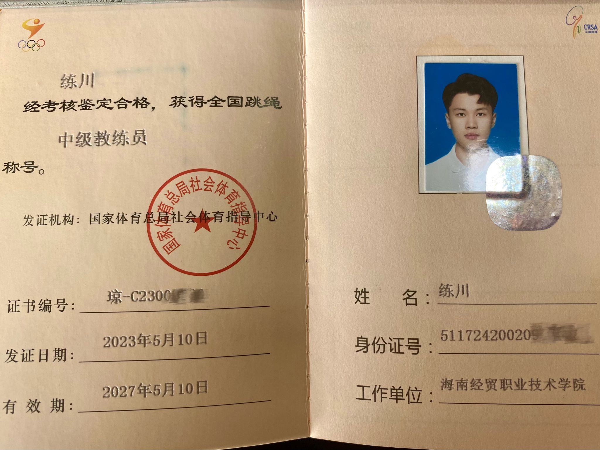 练川始终把“天道酬勤,全力以赴”铭记于心。他刻苦学习,连续两年专业综合测评成绩排名第一,以优异的表现荣获国家励志奖学金和学校一等奖学金。在保证完成学业的同时,他充分利用课余时间,考取了1+X体重管理师、1+X老年康体指导、全国跳绳初级和中级教练员、定向运动二级裁判员、田径二级裁判员、游泳救生员、全国计算机一级等多个职业技能证书。