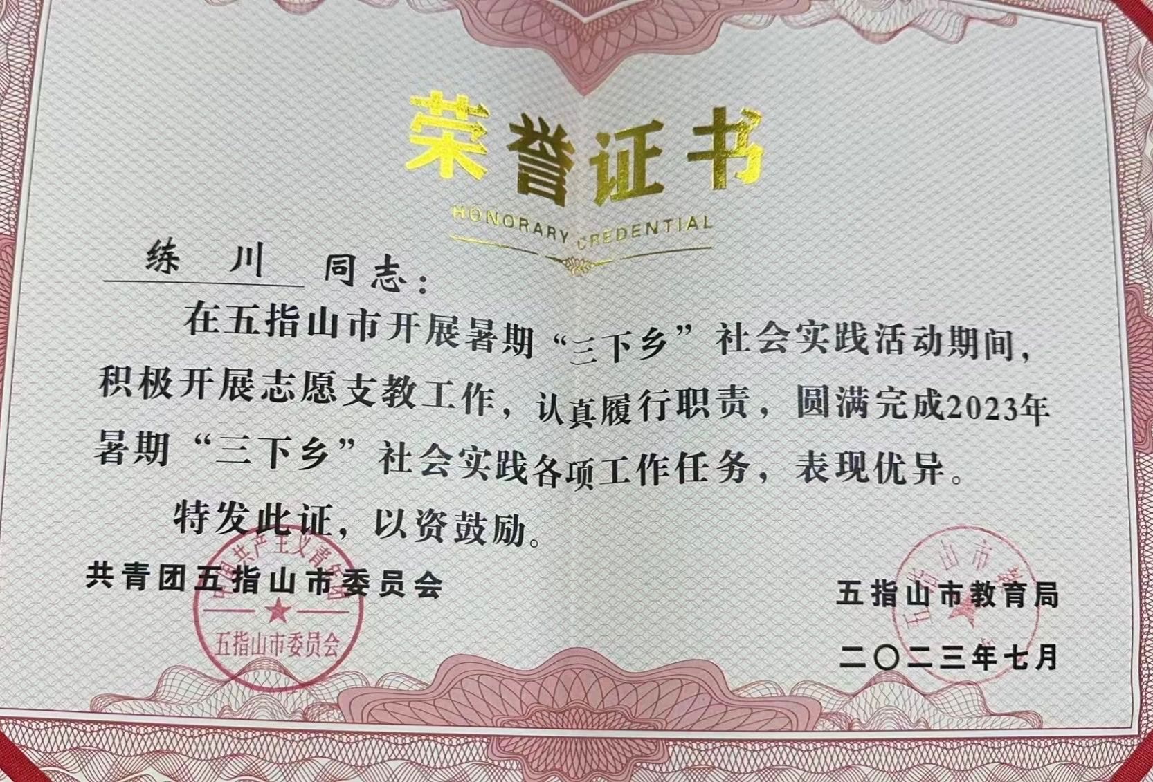 参加社会实践是实现自身全面发展必不可少的一部分。在体育与健康学院“探寻琼中女足精神”“红领巾心向党,我们一起健康成长”“以体育人,助力乡村体育教育”等暑期社会实践活动中,练川前往海南昌江、白沙、琼中、陵水等地,走进乡村社区、小学,用自己所学的技能为老人和学生们普及科学的体育健康知识。在这个过程中,他收获了2022年度学校“最美志愿者”、2023年五指山市暑期“三下乡”社会实践活动表现优异奖等荣誉,用实际行动诠释新时代青年的责任与担当。