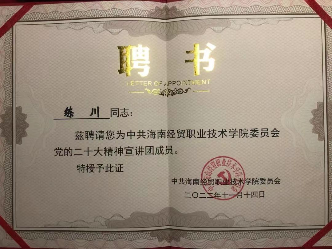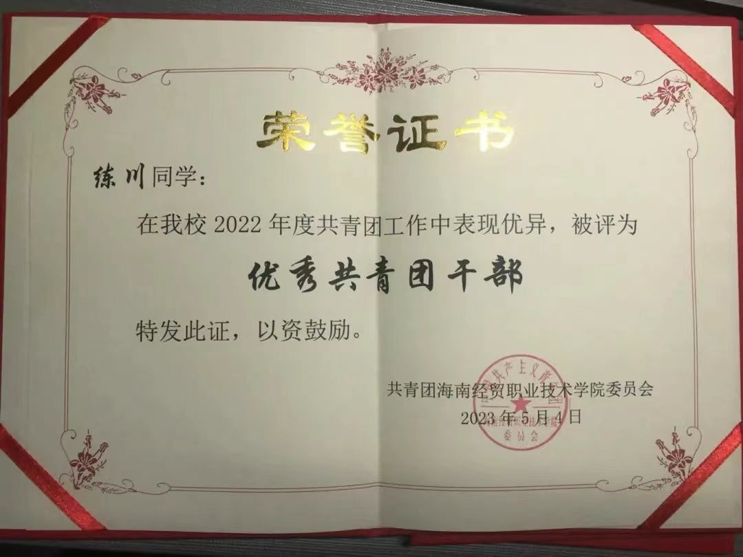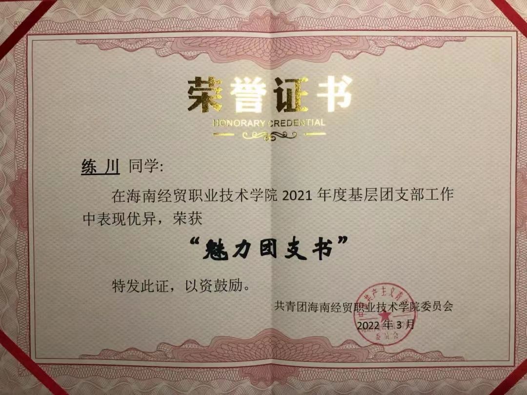 作为团支书,练川主动热情工作,全心全意为同学服务,积极配合老师和班委组织开展丰富多彩的课外活动。“我们班的整体氛围积极向上、朝气蓬勃,大家都团结友爱、互助进步。”同学们说。在练川的带领下,班级团支部获评2022年度海南省高校“活力团支部”荣誉称号,入选2022年度全国高校“活力团支部”风采展示,他也被评为学校“魅力团支书”和“优秀共青团干部”。