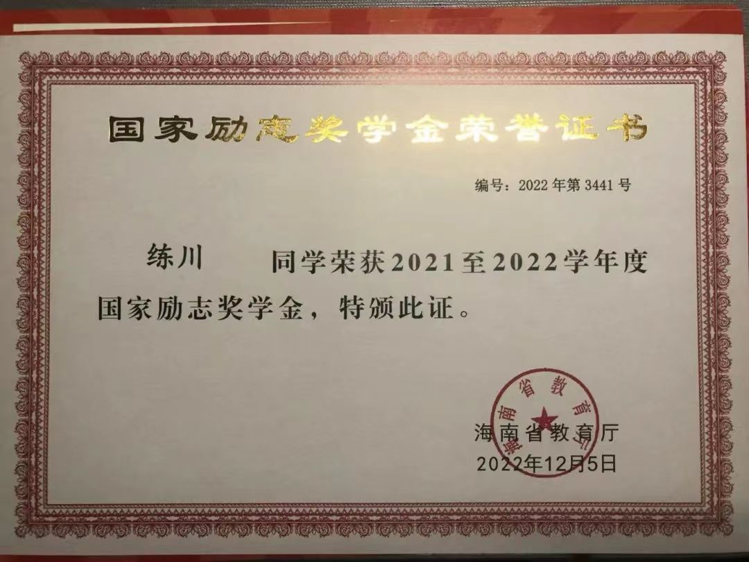 练川热爱体育锻炼,不畏惧挑战,勇于尝试各种新鲜事物,获得了第十届校运会“优秀运动员”、2023年海南省棒垒球公开赛慢投垒球组亚军、2023年海南省定向公开赛男子M21组季军、2023年海口卡丁车挑战书学生组季军等多项荣誉。在一次次探索中,他的个人身体素质得到了提升,自信心和勇气也得到了增强。“我愿意尝试各种体育运动,喜欢旅行,喜欢打卡新地标。”练川正是用这种乐观积极、自立自强、勇于挑战的精神时刻激励着自己,鼓舞着他身边的人。
