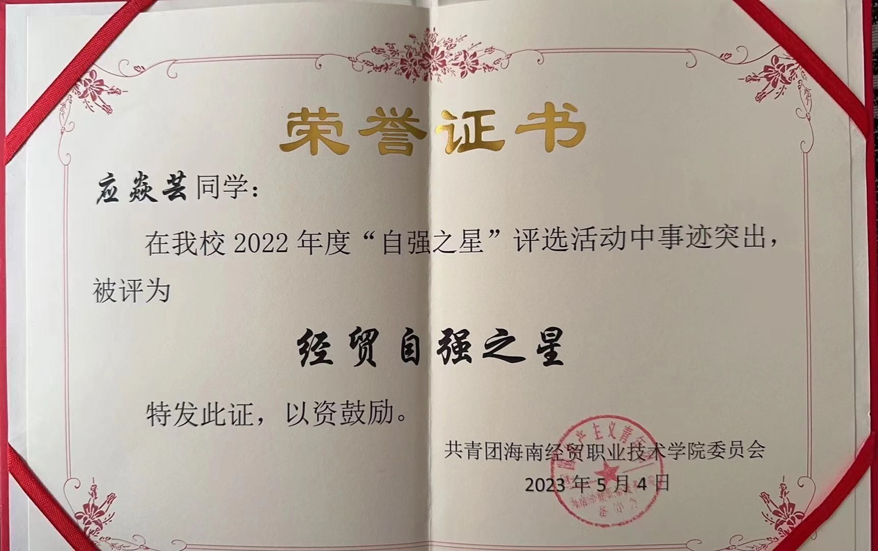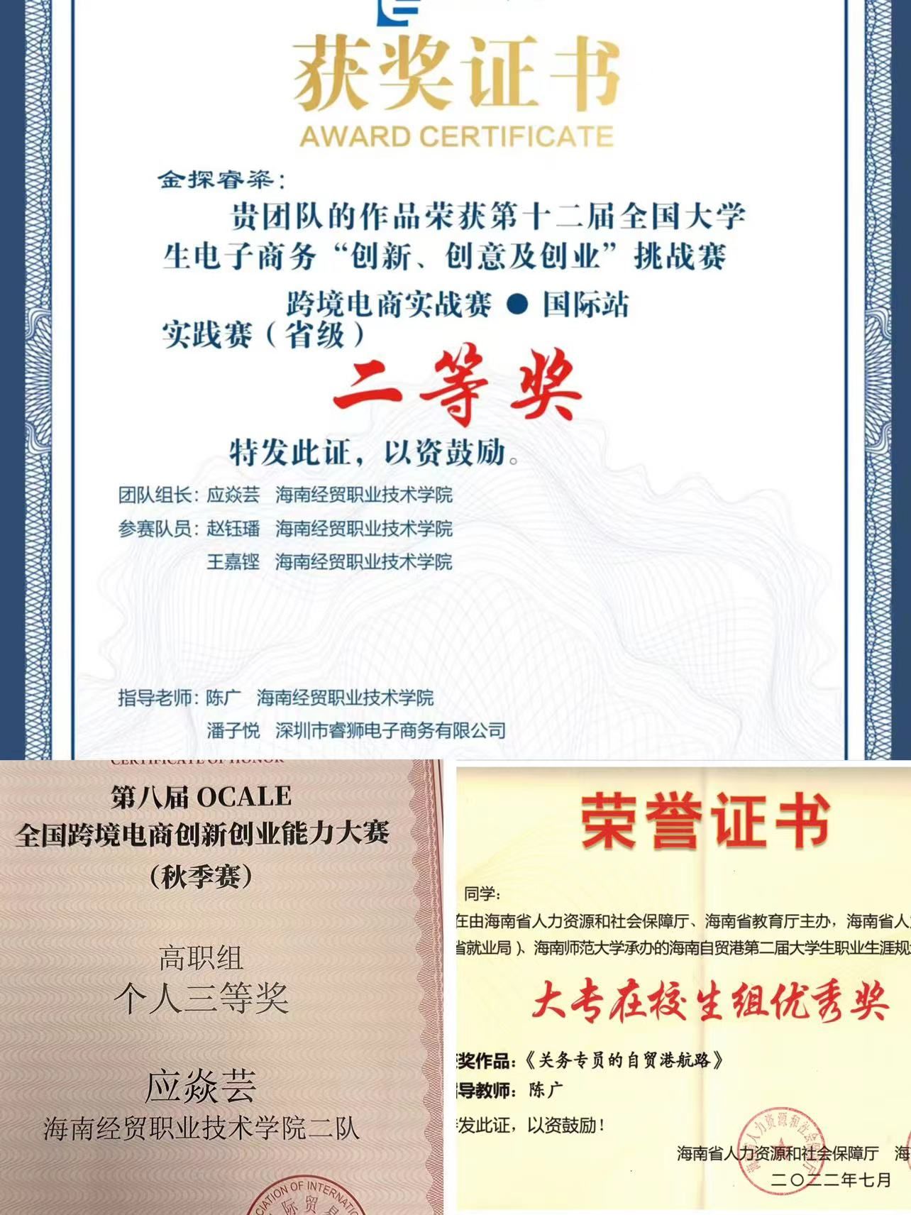 “学而不思则罔,思而不学则殆。对于学习,我从来不敢怠慢。”应焱芸连续两年取得专业第一名的好成绩,成功考取了关务水平测试职业技能证书。通过不懈努力,她荣获第五届全国职业院校跨境电商技能竞赛二等奖、海南省职业院校技能大赛高职组“互联网+国际贸易综合技能”赛项三等奖等多项荣誉。“尽管有时候会碰到很多问题和困难,但是我从来没有想过放弃,只有不断追求进步,才能造就更好的自己。”应焱芸说。