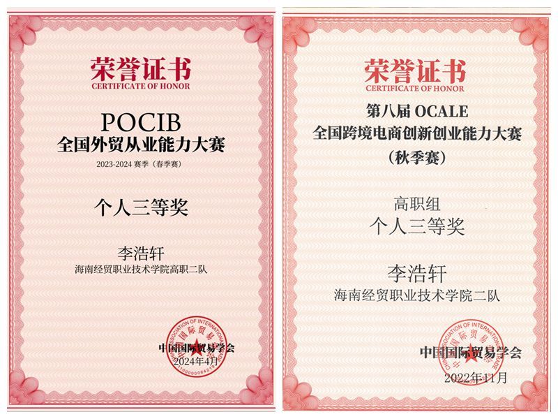 课堂上,他是专注的聆听者;课后,他是知识丛林的探险家。在校期间,李浩轩一直把学习放在首位,积极投入到各门基础课和专业课的学习中,在2022-2023学年专业成绩和学生综合素质测评中均排名第一。他积极参加芬兰线上国际交流合作培训班、Shopee跨境电商基础运营技能等专业相关培训,不断拓展知识。在做好专业学习的同时,他积极参加各类竞赛,获得国家级OCALE跨境电商创新创业大赛三等奖、全国首届大学生职业规划大赛省赛三等奖、“中国教育电视台•外研社杯”职场英语挑战赛(写作赛项)海南赛区一等奖、校级电子商务“三创赛”两项二等奖。“通过参加竞赛,我学习了理论知识,增强了专业技能,也为我的职业发展奠定了良好的基础。”李浩轩说。