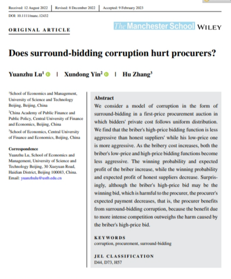 学术视点 | 开云官网张琥老师的合作论文《Does surround-bidding corruption hurt procurers》拟在The Manchester School发表