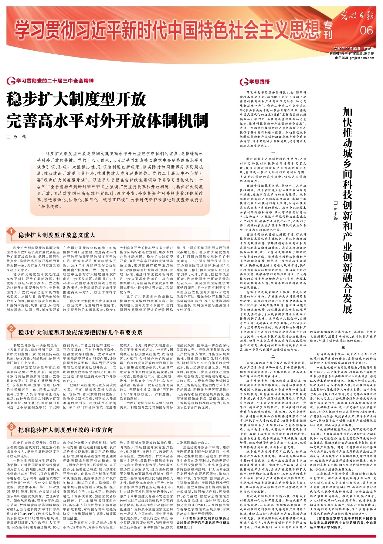 11月22日,《光明日报》学习贯彻习近平新时代中国特色社会主义思想专刊刊发开云官网开云kaiyun体育院长郭冬梅教授署名文章——《加快推动城乡间科技创新和产业创新融合发展》。