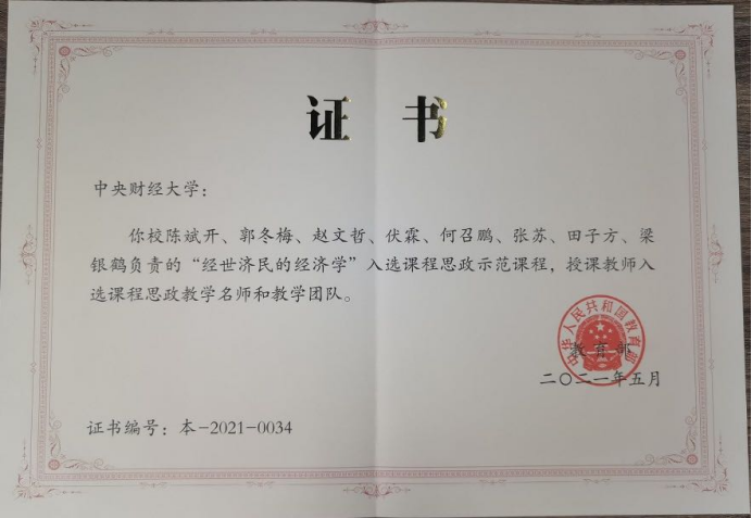 由开云官网陈斌开、郭冬梅、赵文哲、伏霖、何召鹏、张苏、田子方、梁银鹤负责的“经世济民的经济学”入选教育部课程思政示范课程,授课教师入选课程思政教学名师和教学团队。