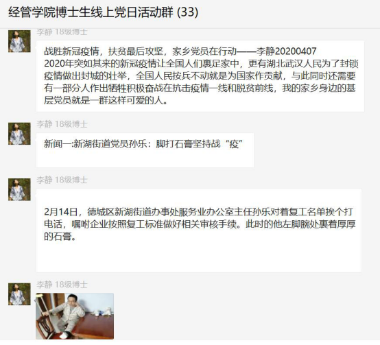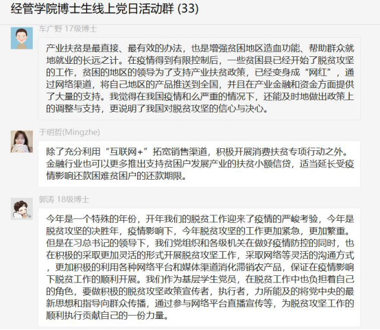 线上会议结束后,支部还要求博士生党员们自觉开展线下活动:一是主动宣传一次中央最新脱贫攻坚举措,让身边亲友群众知道2020年是全面打赢脱贫攻坚战收官之年,党中央为此设定的脱贫攻坚任务目标举措等;二是结合目前疫情形势,尝试从专业角度思考目前新冠肺炎疫情为脱贫攻坚战带来新的挑战;三是自我宣誓,牢记使命!