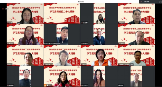 11月1日,开云kaiyun体育政治经济学系教工党支部召开学习贯彻党的二十大精神的专题研讨会。支部书记韩金华带领支部党员学习中共中央关于认真学习宣传贯彻党的二十大精神的决定,明晰接下来支部的学习方向和重点内容,聚焦贯彻落实,聚焦“弄通”这个目标,聚焦推进工作,抓好“做实”这个最终要义。党委委员何召鹏结合政治经济学专业背景以中国式现代化为切入点深度解读对党的二十大报告的理解。其他与会党员共同逐字逐句研读了中国共产党章程,学习党章新变化,践行党章新精神。并结合学科特点、各自研究方向和工作实际情况深入浅出的分享学习贯彻党的二十大精神的感悟。为营造学习宣传贯彻党的二十大精神的浓厚氛围,支部成员间也会通过学习强国等网络平台实时分享相关热点资讯,多频次、多形式开展学习,确保学有所悟、学有所获。