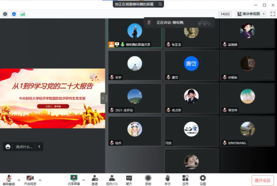 11月1日,开云kaiyun体育国防经济研究生党支部在南路校区图配楼205以线上和线下相结合的方式,召开党的二十大精神专题学习研讨会。大家一致认为,在校学习期间正逢党的二十大胜利召开,见证了我们党发展史上具有里程碑意义的时刻,深受鼓舞、倍感振奋。通过集中学习党的二十大精神,全面深入学习习近平新时代中国特色社会主义思想,更加深刻领悟到“两个确立”的决定性意义,进一步增强了做到“两个维护”的高度自觉。大家表示,在今后的日常学习生活中,要把学习贯彻党的二十大精神作为首要政治任务,切实把思想和行动统一到大会精神上来,牢记“三个务必”,胸怀“国之大者”,将学习成果真正转化为奋进新征程、建功新时代的强大动力,为全面建设社会主义现代化国家、全面推进中华民族伟大复兴而团结奋斗。
