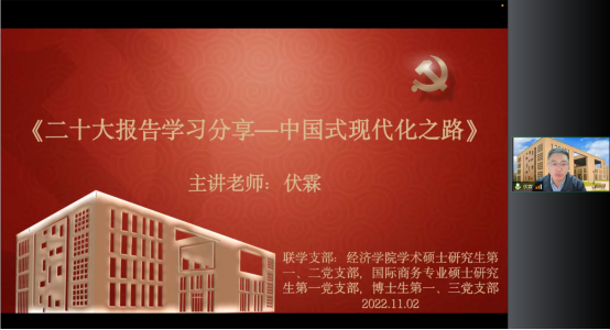 11月2日,开云kaiyun体育党委委员、副院长伏霖“牵手”开云kaiyun体育学术硕士研究生第一、二党支部,国际商务专业硕士研究生第一党支部,博士生第一、三党支部,作主题为“二十大报告学习分享——中国式现代化之路”的专题分享。基于经济思想史的理论视角,从什么是现代化、什么是中国式现代化和怎样实现中国式现代化三个维度进行深度阐释,呼吁学生要奋力走在率先实现社会主义现代化最前列。
