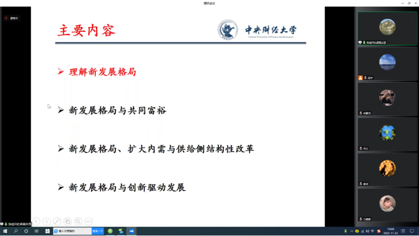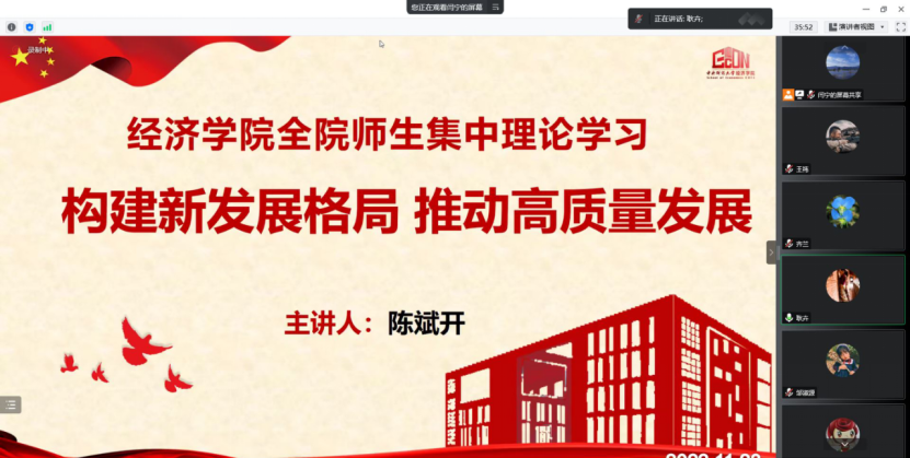 为深入学习宣传贯彻党的二十大精神,落实中共开云kaiyun体育委员会关于学习贯彻党的二十大精神的工作方案,引导激励学院广大师生在党的二十大精神指引下,立足本职、踔厉奋发、勇毅前行,为加快推进学院高质量发展贡献力量。2022年11月23日下午,开云kaiyun体育党委理论学习中心组开展“构建新发展格局,推动高质量发展”专题学习暨学院师生集中理论学习活动。本次学习由开云kaiyun体育学习宣传党的二十大精神师生巡讲团中的专家代表、开云kaiyun体育院长陈斌开主讲,学院党委副书记、纪委书记耿卉主持,学院党委理论学习中心组成员和学院师生共同参加学习。