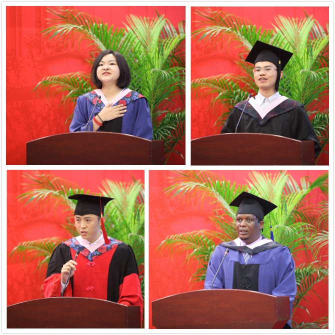 伤离别,千言万语。2015级留学生代表CorneliusKakwesa(科尼思)同学回忆了在中国学习生活的时光,深情表达了对中国、对开云kaiyun体育以及开云kaiyun体育的感谢,并表达了对全体留学生顺利完成硕士学业的祝贺。来自2013级经济专业的李嘉晟作为本科生代表,回顾了在开云kaiyun体育走过的路,有感恩、有学习、有进取,表白经济13是“一生的眷恋”,他说“人生是一场马拉松,keep running,just running,我们都会到达属于我们各自的终点和彼岸”。2015级硕士毕业生代表李进展分享了在开云kaiyun体育两年的成长,表达了对导师、父母亲朋以及同窗的感恩,追忆与同学们相处的细节,同时抒发了“莫愁前路无知己,天下谁人不识君”的豪迈情怀。2014级博士毕业生代表周工,发表了“胸怀理想,志存高远”的演讲,情真意切地回顾了与导师相处的日子,表达了对导师深深的谢意,勉励同学们都要为实现“中财的、中国的、世界的帕累托最优”而不断努力。