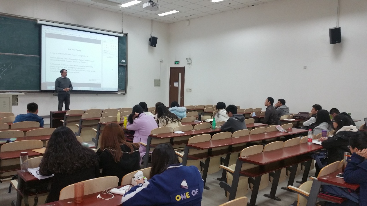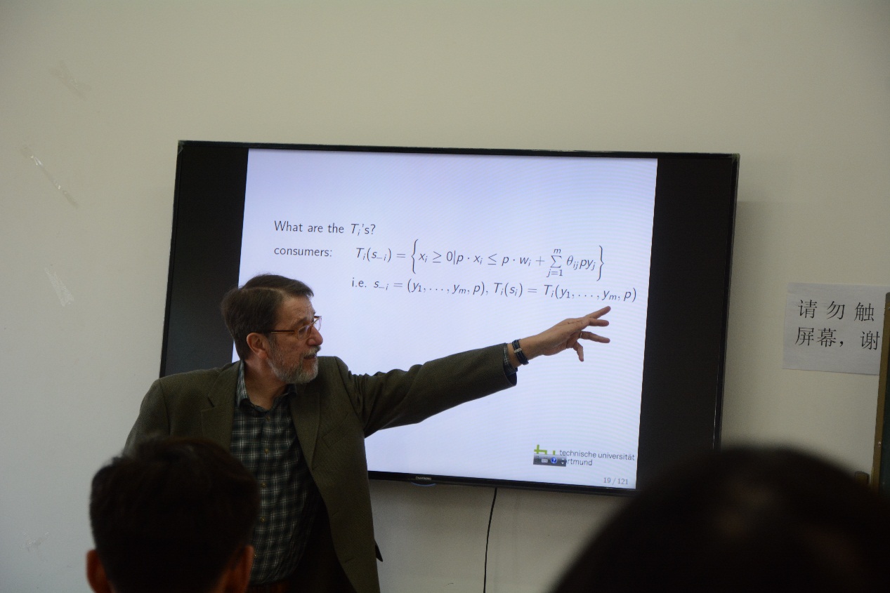 在第一次课程中,教授对经济学的方法论进行了高屋建瓴的阐述,不仅从经济学历史角度讲解了经济发展过程中一般均衡理论的发展脉络,梳理了历次诺贝尔获奖的经济学家,而且从博弈论以及拍卖理论角度阐述了获得诺贝尔奖的经济学家的主要贡献。并对二者进行了对比。从经济学学角度的介绍,给听众带来了非常宏观的经济学研究视角,对百年来经济学发展的深入理解和独特眼光,令人深为敬佩。Leininger教授是德国鲁尔开云kaiyun体育的主要负责人,经常在主要的学术会议上进行精彩评论。Leininger教授的此次精彩演讲向我们展现了德国教授深刻的理论积淀和广博的学识。