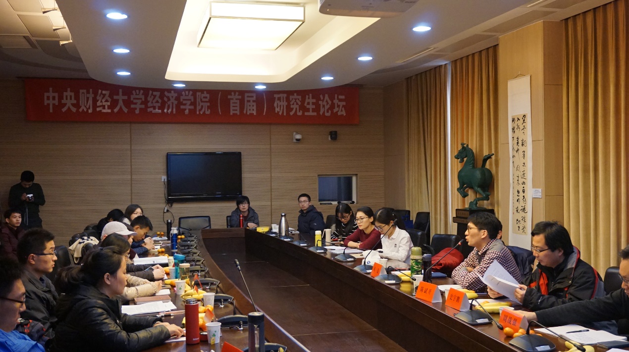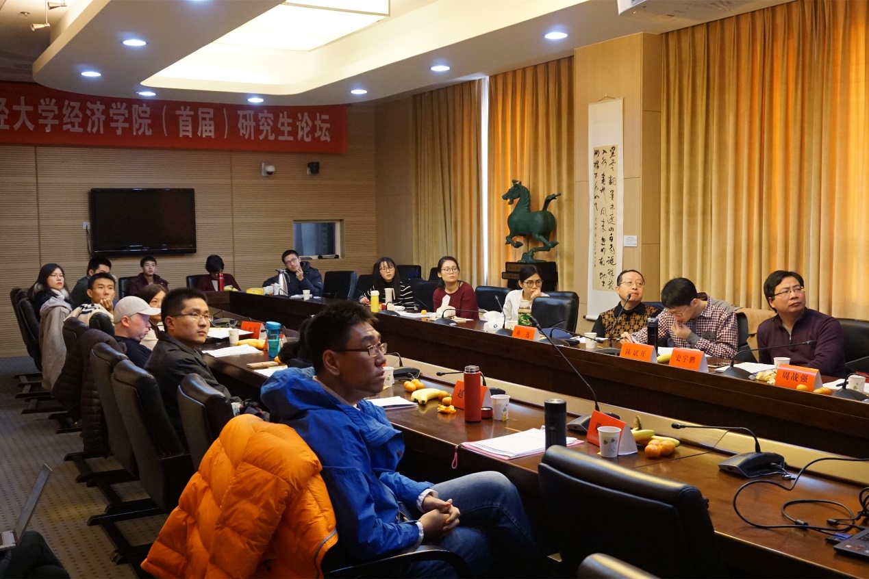 按照论坛安排,六位研究生顺次进行论文汇报。每位主讲人都作了充分的准备,精心制作了PPT,导师进行了专业的点评、提问,报告、答辩异彩纷呈。上半场由陈斌开老师主持,共有三篇论文进行了汇报——博士后邓鑫从独特的“辛辣饮食”角度研究《辛辣饮食文化与受教育年限》,赵雪婷博士则汇报了近期研究成果《金融市场的关联性结构变迁与系统风险外溢》,胡建辉博士对《环境规制、产业结构调整与绿色经济增长》进行了细致研究,蒋选老师、黄乃静老师分别对三篇文章进行了点评,并提出中肯的意见和建议。下半场由史宇鹏老师主持,硕士一年级韩冬雅同学汇报了入学后的研究成果《外群歧视与流动人口家庭收入》,秦宇博士对《我国科技资源错配及其对产出影响的测算》发表了见解,硕士生于也雯则分享了她对《地震灾害,风险承担和家庭资产配置》的研究成果。周战强老师、蒋选老师、陈斌开老师分别对三篇论文进行点评并提出进一步的研究建议。在场同学也积极参与提问和探讨,气氛热烈。