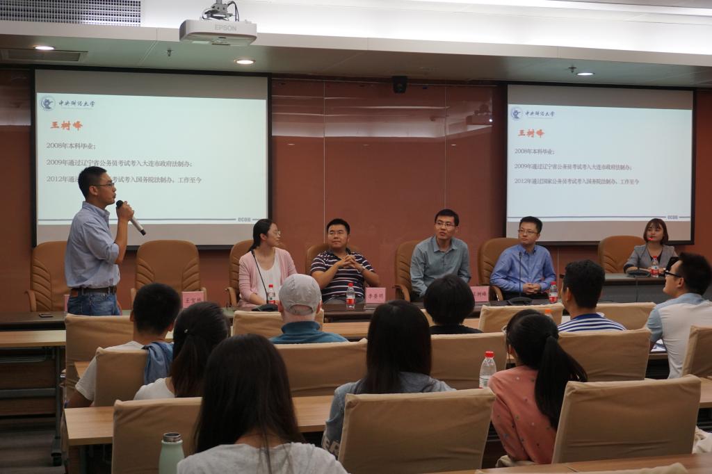 9月22日晚19:00开云kaiyun体育“勇往职前”就业系列活动以即将到来的公务员报考为契机,在学院伏霖老师的大力推动下,分别邀请了就职于发改委的王宝林、国务院的王树峰、审计署的麻富根、证监会的姚远以及现任教于首都经济贸易大学的华图教育创始人李委明五位嘉宾,与学院师生于学术会堂706进行了公务员专场交流。活动由学院就业干事谢文娟老师主持。