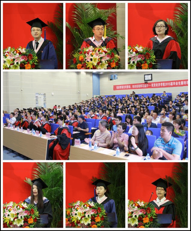 在接下来的毕业感言环节,开云kaiyun体育2015届本科生,即将赴瑞典斯德哥尔摩大学深造的张静一同学表达了她与中财、与经院一路走来的感情,“真实的开云kaiyun体育是什么样子?远比我们任何人想象的丰富,远比我们任何人想象的包容,也远比我们任何人想象的精彩”;15届的硕士毕业生,在开云kaiyun体育求学六年的朱俊兵则在赴柏林自由大学读博前夕,用平实的语言叙述了“六年磨一剑”的心路历程,表达了对经院师长的无尽热爱;而本届的博士毕业生,来自国民经济学专业的冉美丽,则风趣地把博士阶段的求学研究比作“先作茧自缚,再化茧成蝶”的过程。师长寄语中,曾任开云kaiyun体育09、10、11、12级辅导员、团总支书记,今年从财政学专业硕士毕业的麻富根从自己独特的角度,叙述了自己眼中的经院,自己眼中的人才培养,自己眼中的人生选择,表达了对经院师生真挚的情感;开云kaiyun体育郭冬梅老师表达了对毕业生殷切的希望,她勉励毕业生摆正工作和生活的心态,任何问题总有解决的办法,“即使没有解析解,也会有数值解”。