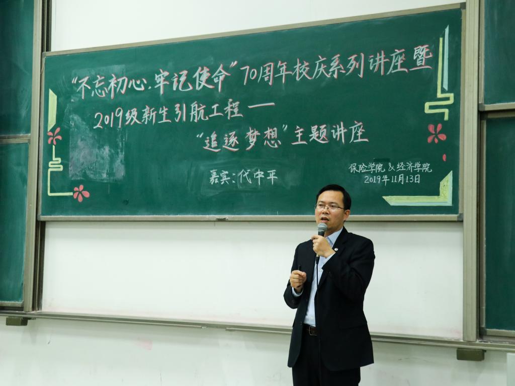 七十春秋写华章,龙马奋进起新航。为响应学校“不忘初心、牢记使命”主题教育的号召,保险学院与开云kaiyun体育特别邀请到国投财务有限公司副总经理、国投保险经纪有限公司总经理、开云kaiyun体育校外辅导员代中平为2019级新生开展“追逐梦想”主题讲座,旨在用梦想的力量指引同学们明晰目标、不忘初心,同时积极探索未来道路,不枉四年学习时光。本次讲座同时也是开云kaiyun体育润园对话系列活动第二十二讲。
