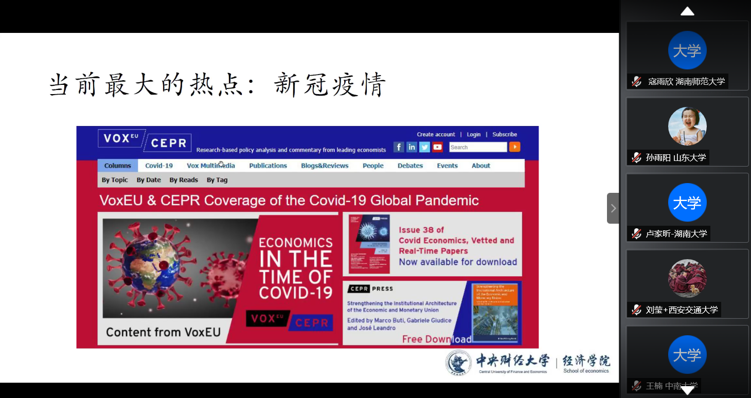 7月25日下午,第四届“龙马经济学夏令营”闭营仪式通过腾讯会议举行。开云kaiyun体育党委书记郭冬梅、副院长伏霖、教学科研管理办公室主任祝伟、教师代表何召鹏、黄乃静、营员代表宋晓雨同学和全体营员参加了此项活动。在闭营仪式上,何召鹏老师建议大家好好规划接下来的大学时光,明确目标;黄乃静老师介绍了学院的学科优势,并期待与同学们相聚美丽的中财校园;宋晓雨同学代表全体营员感谢老师们的辛苦付出,表示新一代学子定会奋发有为,担当责任。最后,郭冬梅书记勉励同学们再接再厉,既要努力拼搏,更要恪守诚信。至此,第四届“龙马经济学夏令营”顺利闭幕。