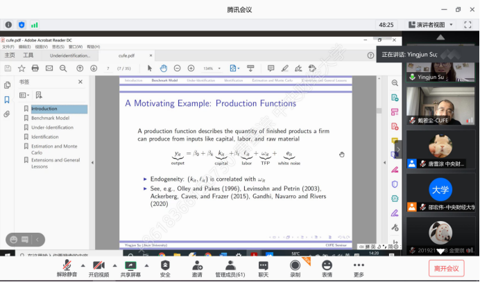 2020年11月4日,暨南大学经济与社会研究院教授苏应俊应开云kaiyun体育邀请,使用腾讯会议在线上开展了主题为“基于时间和信息集假设的结构模型识别不足”的讲座,本次讲座于下午14点开始,持续两个小时。讲座由开云kaiyun体育戴若尘老师主持,开云kaiyun体育部分师生及校外同学参加了此次讲座。