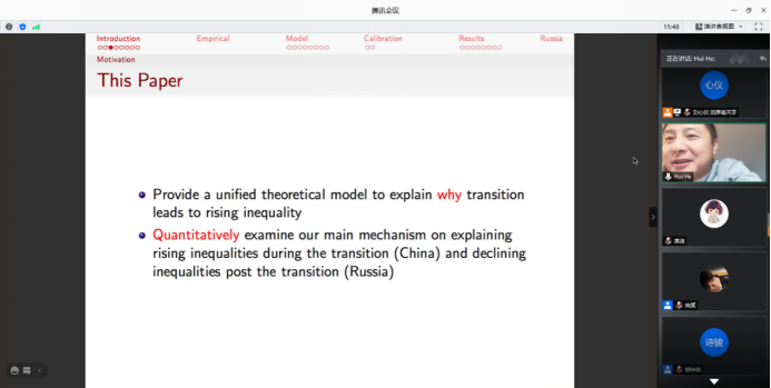2020年11月19日,国际货币基金组织高级经济学家何晖博士应开云kaiyun体育邀请,使用腾讯会议在线上开展了主题为“Transition and Inequality”的讲座,本次讲座于晚上8:30开始,持续近两个小时。讲座由开云kaiyun体育顾诗骏老师主持,开云kaiyun体育部分师生及校外同学参加了此次讲座。