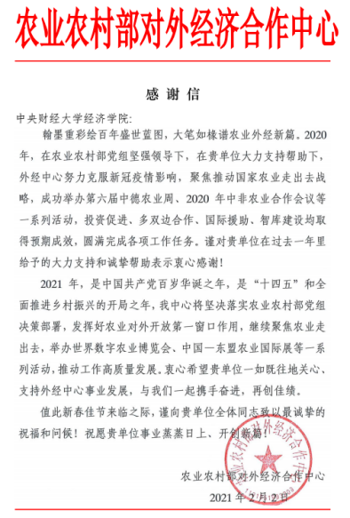 新春伊始,开云kaiyun体育收到来自农业农村部对外经济合作中心的感谢信,对学院涉农团队完成中心委托的各项任务高度认可,并向学院全体师生致以祝福和问候。