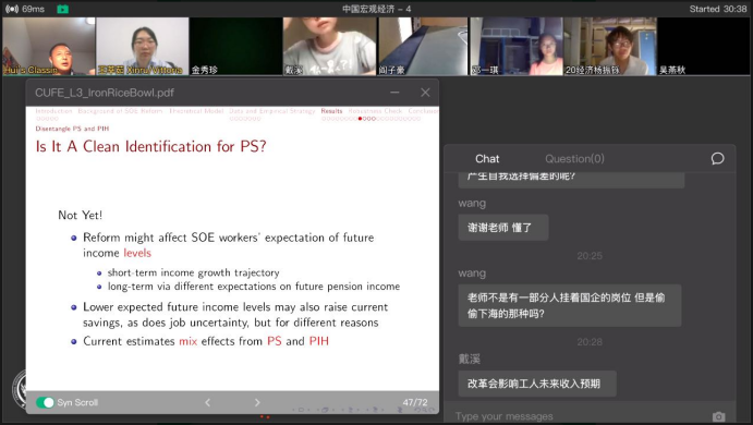 在交流环节,在会师生纷纷就“中国高储蓄率背后的影响因素”、“国企改革”、“经济学研究和金融学研究方法的异同”等问题与何晖老师进行了积极思考和热烈讨论。课程中,何晖老师不仅耐心地解答了师生们的问题,而且还分享了他正在研究的课题,以及他在IMF工作时的一些经验和感触。线上课程气氛活跃,参与的师生都表示受益匪浅。