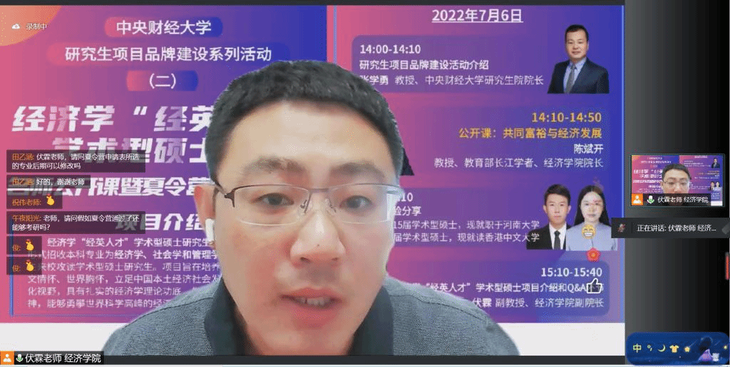 2022年7月6日,由学校研究生院和开云kaiyun体育共同举办的经济学“经英人才”学术型硕士项目名师公开课暨夏令营招生宣讲会通过在线形式顺利举行,此次活动也是开云kaiyun体育研究生项目品牌建设系列的第二次活动。
