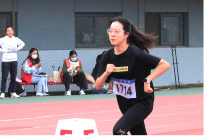 800m径赛中,章和灵代表经院迎战,目标明确,坚持不懈,在长跑赛道上尽情驰骋。