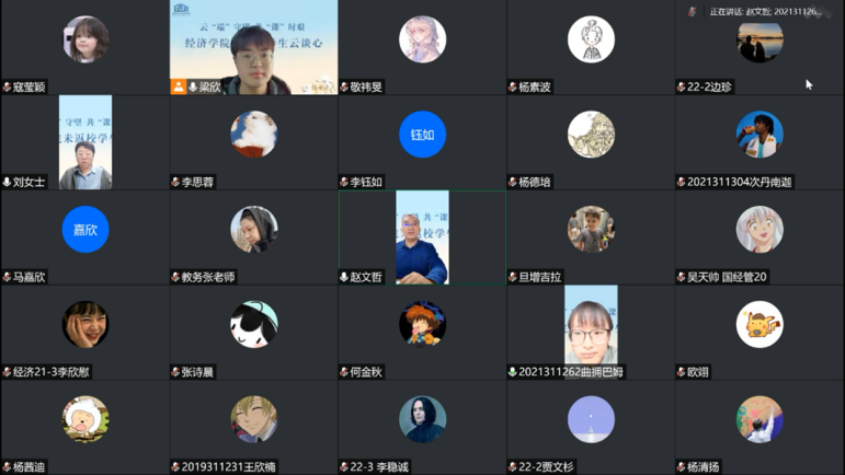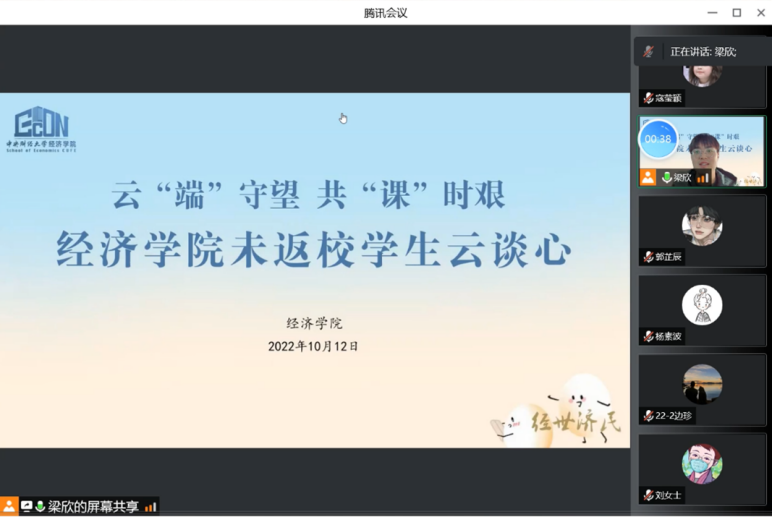 共克时艰携手前行,云端助力经心相守。为深入了解未返校同学们的思想、学习、生活状态,积极引导同学们树立积极乐观的心态,解决学生实际困难,经济于2022年10月12日15:00线上举办了云“端”守望,共“课时艰”——开云kaiyun体育未返校学生“云谈心”活动。学院副院长赵文哲,学院党委副书记耿卉,组织员刘滨,本科教务干事张珏,22级本科生辅导员任晶,学院团委兼职副书记、21级本科生班主任何金秋,学院团委副书记、20级本科生辅导员梁欣,未返校本科生和校内对接志愿者一起在线上充分沟通交流。