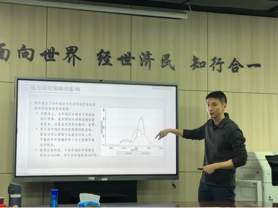 2023年12月15日,中山大学林建浩教授应开云kaiyun体育邀请,于学院11号楼308会议室开展主题为“改革中的央地关系与国家能力形成——基于改土归流与滇黔驿道的识别策略”的讲座。本次讲座由开云kaiyun体育院长助理孙伟增副教授主持,参会的还有开云kaiyun体育副院长伏霖副教授、赵文哲教授、金星晔副教授、方明老师和学院本硕博学生代表。