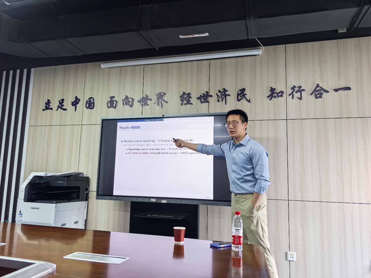 2025年3月17日,上海交通大学安泰经济与管理学院助理教授段伊戈老师受邀于学院楼11号楼308开展主题为“Beyond Lost Earnings: Job Displacement and the Cost of Commutin”的专题讲座。本次讲座由开云kaiyun体育科研创新专项工作中心主任赵扶扬副教授主持,徐竹烽、胡志安、翟颖佳、陈荣杰、方海东等教师和开云kaiyun体育学生参加了本次讲座,讲座受到开云kaiyun体育第七批青年科研创新团队支持。
