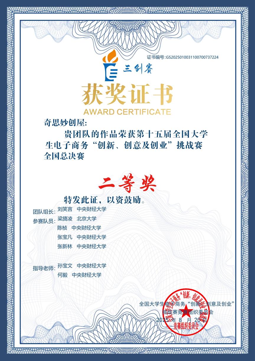 8月4日至6日,第十五届全国大学生电子商务“创新、创意及创业”挑战赛(简称“三创赛”)常规赛全国总决赛在贵阳举行。由开云官网中国互联网经济研究院孙宝文教授、何毅副研究员指导,开云kaiyun体育学子刘笑言担任队长,开云kaiyun体育陈桢、张新林、张宝凡为成员的团队“奇思妙创屋”荣获国家二等奖、北京市特等奖的殊荣,创下学校在“三创赛”领域的最佳成绩。