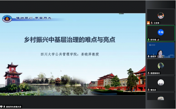 2022年7月21日,四川大学城市治理研究院院长姜晓萍教授受开云kaiyun体育党委邀请,以“乡村振兴中基层治理的难点与亮点”为题开展讲座,拉开本次“乡村振兴”系列讲座的序幕。会议由党委书记郭冬梅主持。开云kaiyun体育中层领导班子及师生、雁翅镇李栋镇长,各村“两委”班子成员,镇机关“马克思主义青年小组”党员干部共同在线参与学习。